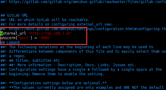 # vim /etc/gitlab/gitlab.rb 将 external_url 变量的地址修改为 gitlab 所在 centos 的 ip 地址 修改 GitLab 默认端口