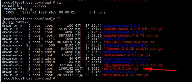 1, 通过 rz 命令将本地的 tar.gz 包上传到 linux 服务器上; 我这里用的是 redis-3.0.2.tar.gz, 上传到 /home/download 下: