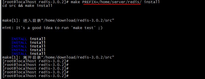 5, 执行 make install 命令进行安装, 我个人习惯将软件都安装到一个指定的目录下, 这次安装的目录是 /home/server/redis 安装目录可以提前建好: