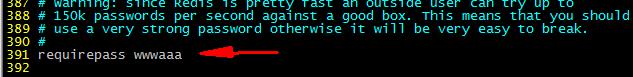 2. 将 requirepass 前面的 #号去掉, 开启密码验证, 然后后面是我设置的密码(大约在文件的 391 行)