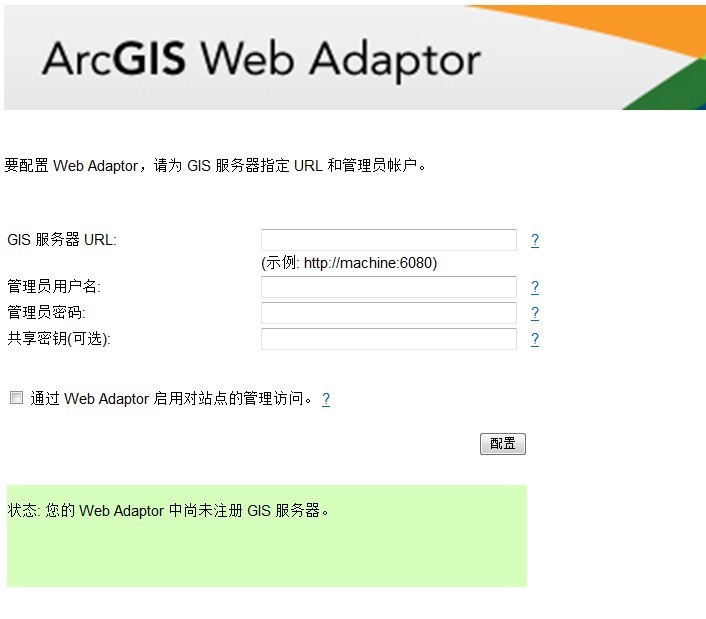 安装完之后,我们需要一个操作就是将 Web Adaptor 跟我们的 Server 关联起来,也就是想 Web Adaptor 注册 Server 站点,我们只需要在浏览器打开 Web Adaptor,就看到一个配置的页面,如下图:
