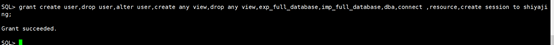 grant create user,drop user,alteruser,create any view,drop anyview,exp_full_database,imp_full_database,dba,connect ,resource,create sessionto shiyajing;