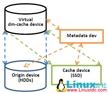linux kernel 通过增加 virtual cache devices 设备来作为 cache 设备的抽象,virtual cache device 基于三个 physical devices 来实现: