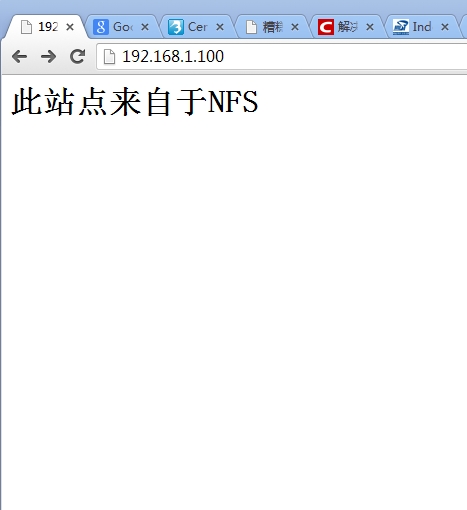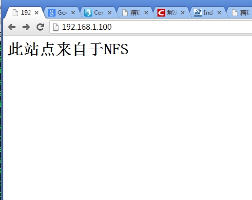 1 2 3 4 5 6 7 8 9 10 11 12 13 14 15 16 17 18 | [root@www /]# yum install -y nfs*[root@www /]# mkdir -pv /www/sharemkdir: created directory `/www`mkdir: created directory `/www/share`[root@www /]# echo -e "/www/share\t192.168.0.0(rw)" > /etc/exports[root@www /]# cat /etc/exports/www/share192.168.0.0(rw)[root@www /]# setfacl -m u:apache:rwx /www/share/[root@www /]# echo "<h1> 此站点来自于 NFS</h1>"> /www/share/index.html[root@www /]# cat /www/share/index.html<h1> 此站点来自于 NFS</h1>[root@www /]# service nfs startStarting NFS services: [OK]Starting NFS quotas: [OK]Starting NFS mountd: [OK]Starting NFS daemon: [OK]Starting RPC idmapd: [OK][root@www /]# |
