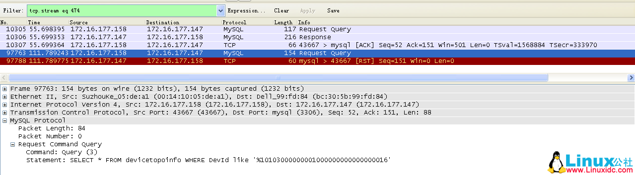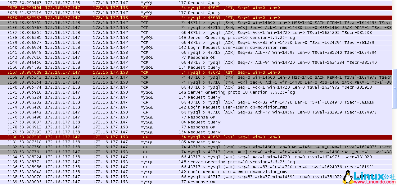 当通过重启 148 机器上的 keepalived 服务来完成 VIP 切换,从而达成 MySQL 主备切换时,可以看到如下抓包信息: