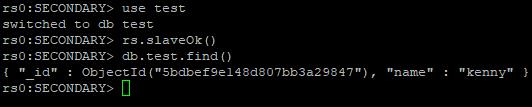 默认情况下,MongoDB 只允许在主节点上写入和读取数据。这里的 rs.slaveOk()是为了在从节点上也读取数据而需要执行的 session(如果退出 mongo shell,需要重新执行该命令)级别的命令。
