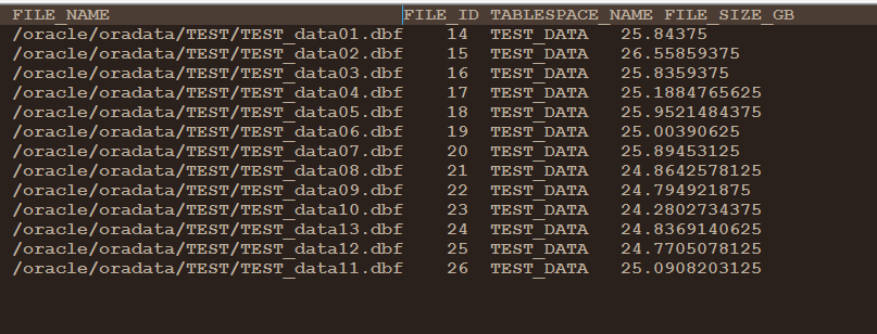 select file_name,file_id,tablespace_name,(bytes/1024/1024/1024) file_size_gb from dba_data_files where (bytes/1024/1024/1024) >10 order by file_id;