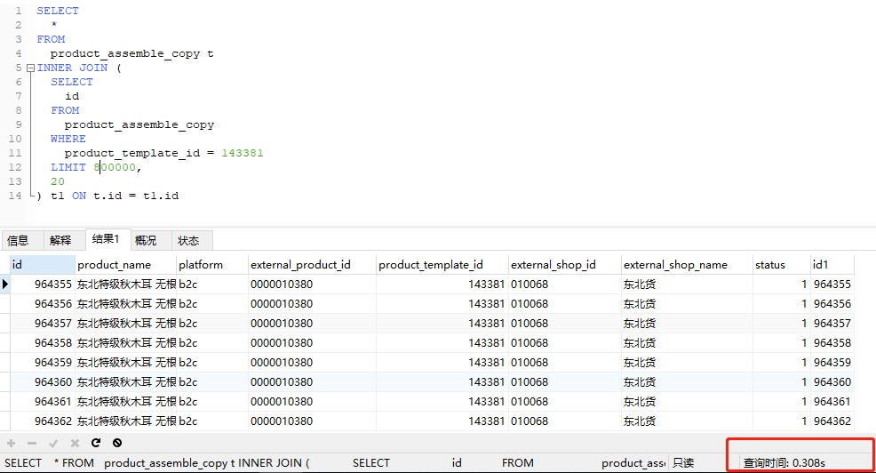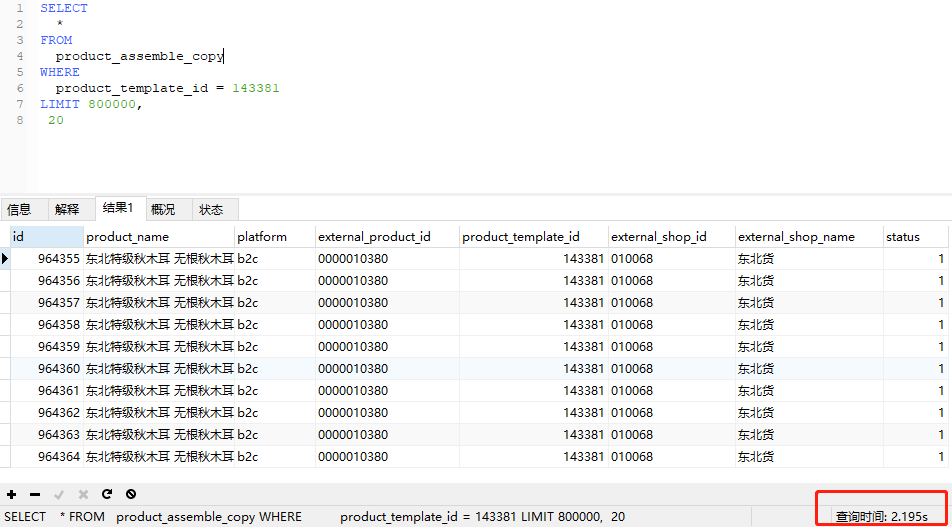 上图是没有优化过的 sql,执行时间为 2s 多。经过优化后如下:
