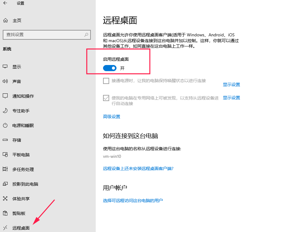 以 Windows 10 为例,打开设置 – 系统 – 远程桌面 – 启用远程桌面进行打开。(防火墙里面也要放行 3389 端口,不清楚的可以直接关闭防火墙)