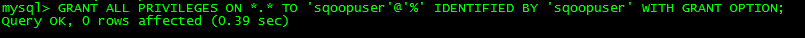 GRANT ALL PRIVILEGES ON *.* TO ‘sqoopuser’@’%’ IDENTIFIED BY ‘sqoopuser’ WITH GRANT OPTION;