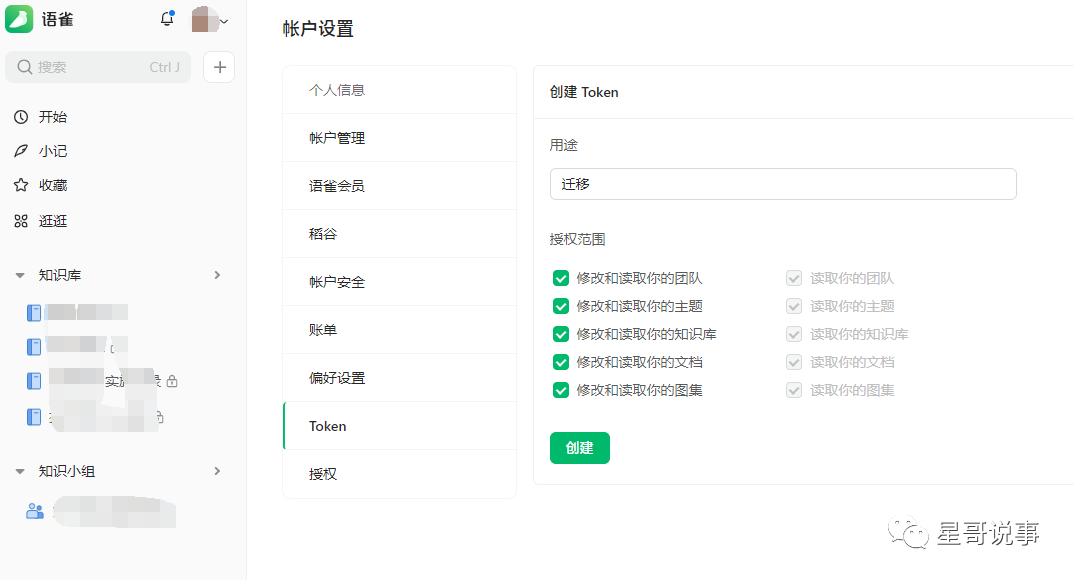 Token:访问语雀 Token 新建,只需要给读取权限即可。