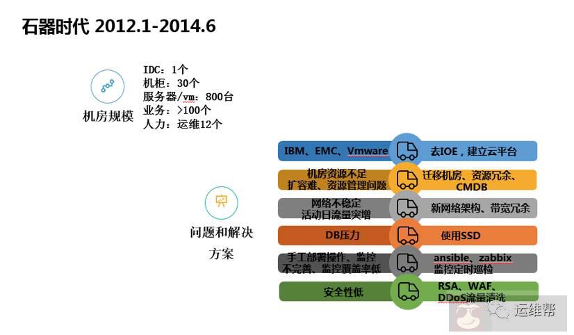 这个时候我们的 IDC 还是 1 个,机柜增长了 30 个,服务器和虚拟机的数量增长了 800 台,业务线拓展到 100 个,人力方面运维人员也扩展到 12 个,但是这个时代还是存在什么问题呢?几个主要的问题说一下