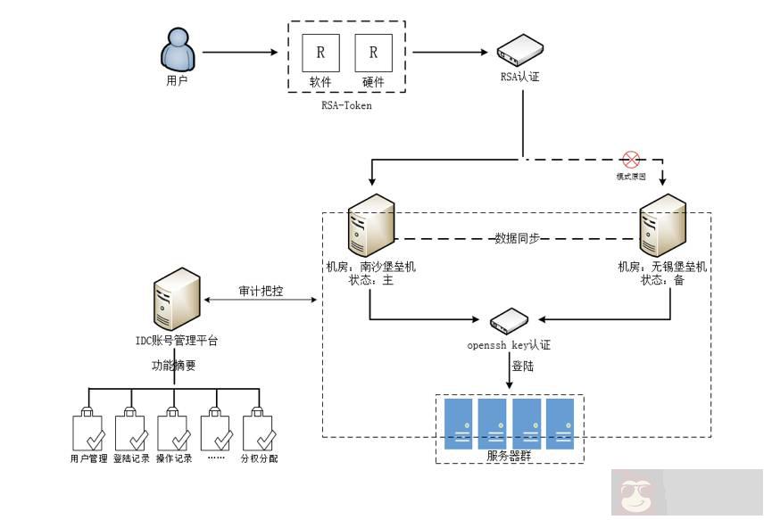 我们的堡垒机架构是在不同机房部署主备堡垒机,两台堡垒机之间的数据是同步的,用户可以申请软件或者硬件的 Token,然后通过 RSA 认证登录到堡垒机,此时 IDC 账户管理平台会对登录用户进行审计把控,包括用户管理、登录记录、分配权限、操作记录等等,最后登录到服务器上。