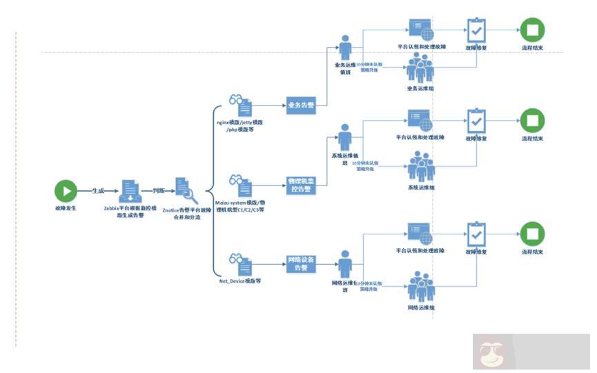 在统一告警平台中配置服务的匹配策略和故障合并,当告警信息从 zabbix 生成后,通过预先设定的脚本发送给告警平台,在触发策略,最后故障合并后,在触发告警升级策略,即告警首先接收人,如 10 分钟没处理,则升级给团队处理。