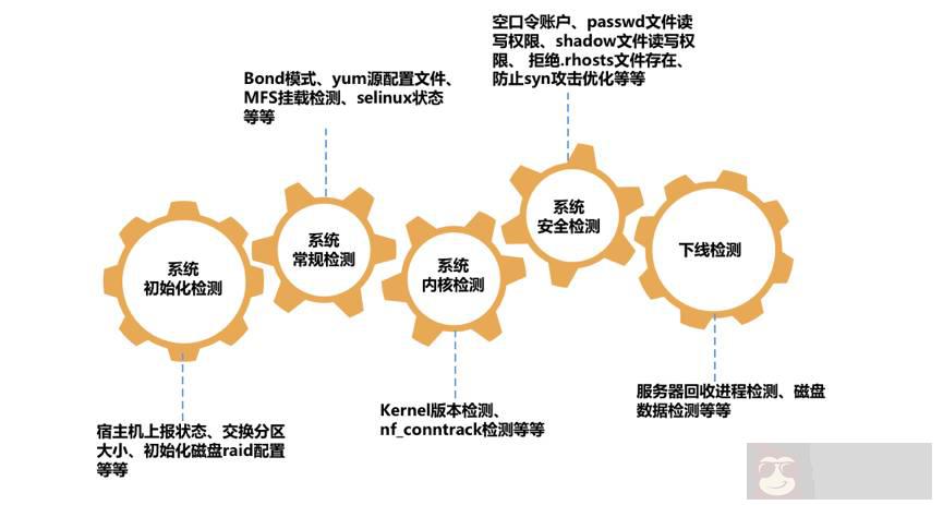 系统巡检主要包括系统初始化检测、系统常规检测、系统内核检测、系统安全检测和下线检测。