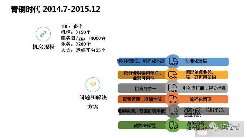 伴随着这些问题的解决,我们已经进入了青铜时代,来看看这个时代的规模,我们是两地三中心,机柜扩展到 150 个,服务器扩展到 4000 台,业务线也发展到 200 多条。在人力方面,我们有 35 个运维人员来支撑。