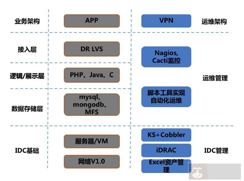 针对这一系列问题,首先在稳定性方面方面,我们会有一些 IDC 的操作人员协助我们做一些管理和操作,另外,我们还会通过带外的管理口对服务器做一些操作,对系统进行重装。我们还有一些自动化的脚本,在自动监控方面早期部署了 NagiosCacti,主要是来监控系统稳定性,网络以及业务稳定性。在架构单点方面,主要还是靠人为来驱动,主要是推动业务部署高可用架构,提高业务的可用性这样的一个解决方案。
