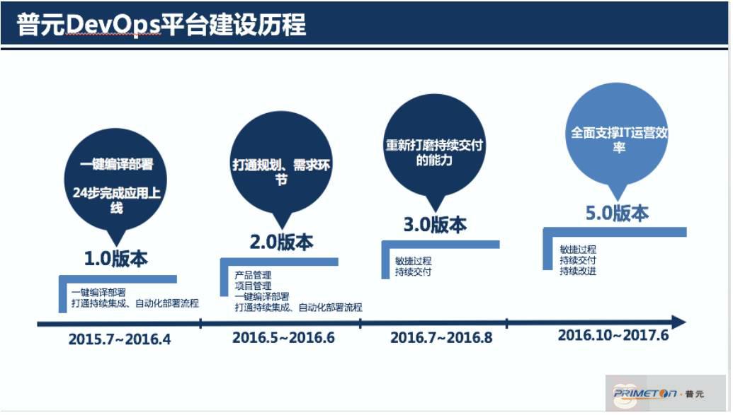 2015.7~2016.4:为支撑企业数字化转型,普元开始研发数字化企业云平台(ThePlatform),于 2016 年 4 月完成 1.0 版本并进行内部上线。1.0 版本主要提供了持续集成和持续部署的能力,同时还包含了自己的容器云平台,与容器云平台对接,贯穿设计、开发、测试、上线、维护五大软件研发生命周期,打通代码提交、触发集成、自动部署到容器云的快速链路。