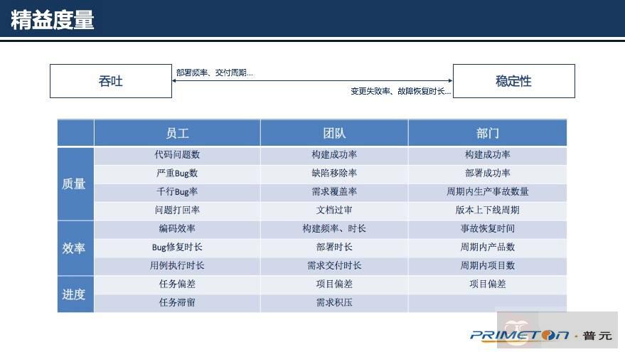 - 如何支撑企业 IT 精益运营?精益运营的基础是度量,度量的三大维度:指标、执行监控、预测。首先是明确指标和执行监控,基于软件全生命周期的度量过程中企 执行监控业遇到的最大困难莫过于拿不到完整的数据,各个部门、各个流程、各个系统之间数据相互隔阂,信息很难流通,导致无法从整体的角度对软件过程进行度量。当 DevOps 平台能打通企业的软件生产全生命周期时,数据的割裂性问题自然也就不存在。当然,度量不仅仅是事后的统计分析,更应该提供过程监控的能力,在过程中,通过一些看板(比如任务看板、需求看板、发布看板)、趋势图(比如任务燃尽图、bug 燃尽图)等,提前预知风险,规避风险,持续把控项目质量和产品质量。我们目前主要从质量、效率、进度三个维度,普通员工、团队负责人、部门领导等角色视角出发,提供如下能力: