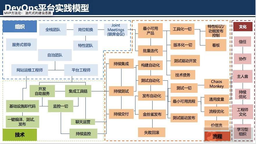 DevOps 的实施和企业的组织、技术、流程、文化紧密结合,根据我们的经验,在企业中,技术方面的实践最容易在团队中实践,流程次之,组织的优化与变革则是最为困难的。很多时候,不是技术上打不通整个生命周期,而是一些客观的因素导致无法打通各个部门。