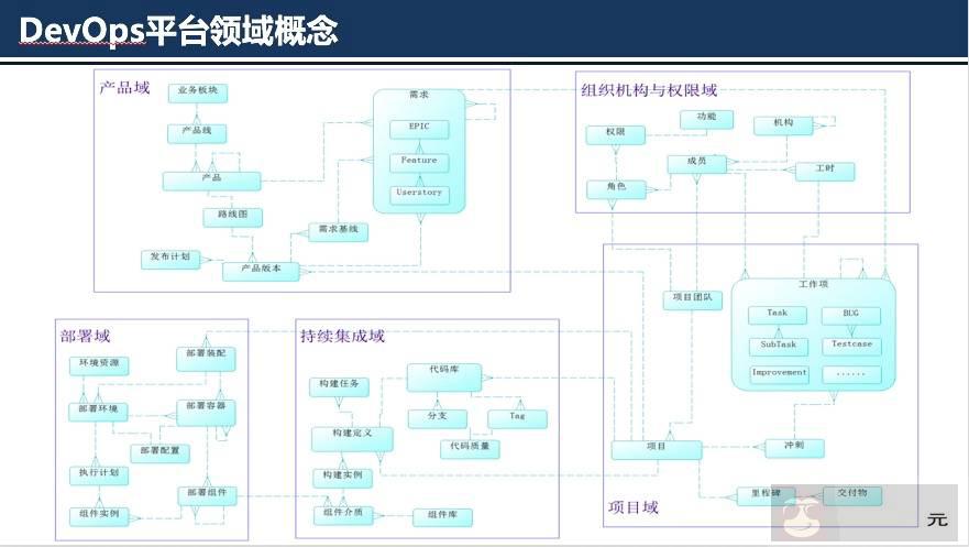 先看看 DevOps 的整体架构,正如最一开始所说,我们把 DevOps 平台划分为三大模块:敏捷过程、持续交付、持续改进。平台的概念模型如图所示,划分为 5 大领域:产品域、组织机构与权限域,项目域、部署域、持续集成域。