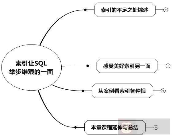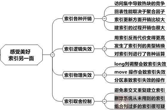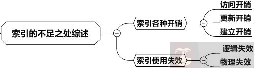 关于索引的不足之处,我们可以从索引的开销和容易失效这两个方面来讨论,如下图所示: