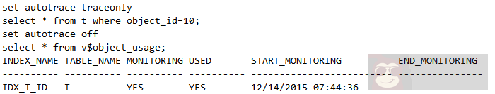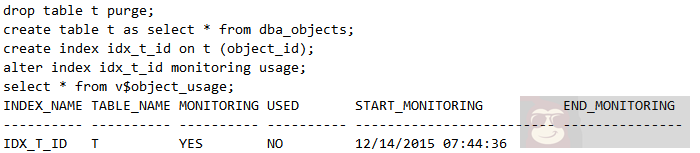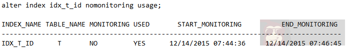 停止对索引的监控,观察 v$object_usage 状态变化,发现 MONITORING 的值为 NO,且 END_MONITORING 记录了停止监控的时间,如下: