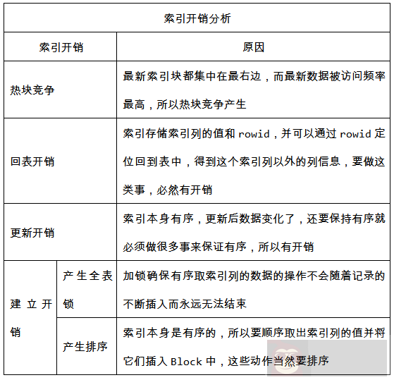 还有千万别忽略了建立索引的开销,这也和索引的有序性有关。我们在建索引的过程中,首先把索引列的数据排序提取出来,再插入到块中形成索引块,这时如果数据不断地插入,排序提取这个动作什么时候能结束呢?所以还必须要锁表,这就是一个很大的开销(Online 建索引是一种特殊的思路,这里不做描述)。当然建索引过程中排序这个动作本身也是一个不小的开销。