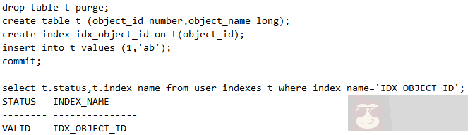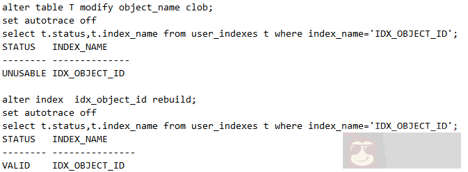 接下来将 long 修改为 clob,发现索引失效了,必须重建索引,如下: