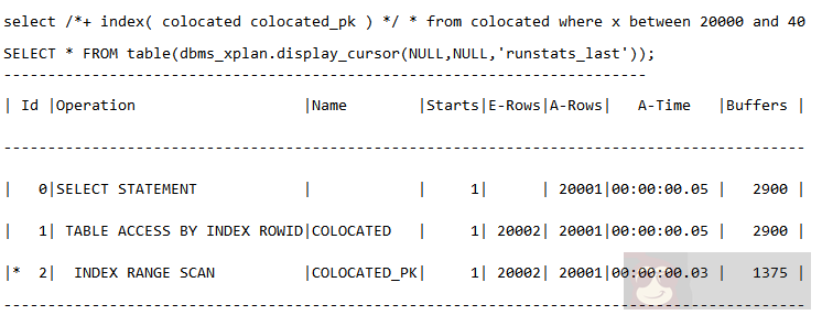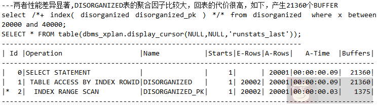 结论:索引查询要尽可能避免回表,如果不可避免,则需要关注聚合因子是否过大。(注:这个例子在前面的章节已经说过了,这里就不再详述了。)在该例子中,构造脚本 organized 表的聚合因子比较小,回表的代价较低,产生了 2900 个 buffer,如下: