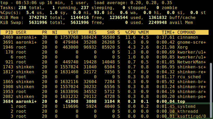 top 是一个强大的工具,它能给你提供 运行系统的动态实时视图,如下面截图所示: