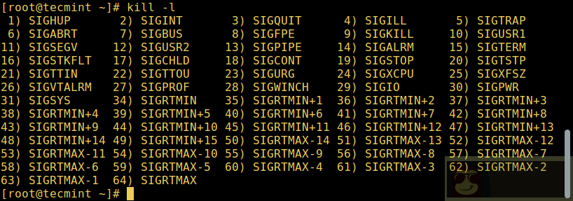Linux 中控制进程的基本方法是给它们发送信号。你可以发送很多信号给一个进程,运行下面的命令可以查看所有信号: