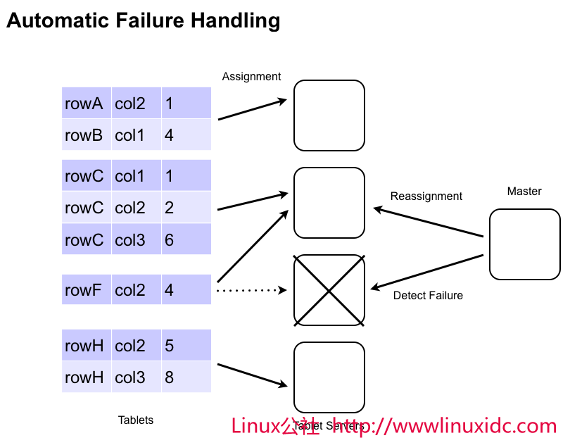 如果 TabletServer 失败,法师检测,并自动从故障服务器分配到其他服务器重新分配片。任何键 – 值对,在内存中的时间 TabletServer 失败自动重新应用预写式日志,以防止丢失任何数据。