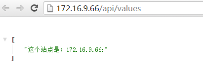 然后咋们来通过 80 端口访问以下我们部署的接口(这里我 ubuntu 服务器的 ip 是 172.16.9.66):http://172.16.9.66/api/values,访问成功的截图: