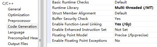 7)定位到 Configuration -》C/C++ -》Code Generation, 修改 Runtime Library 项为 Multi-threaded(/MT),如下图所示: