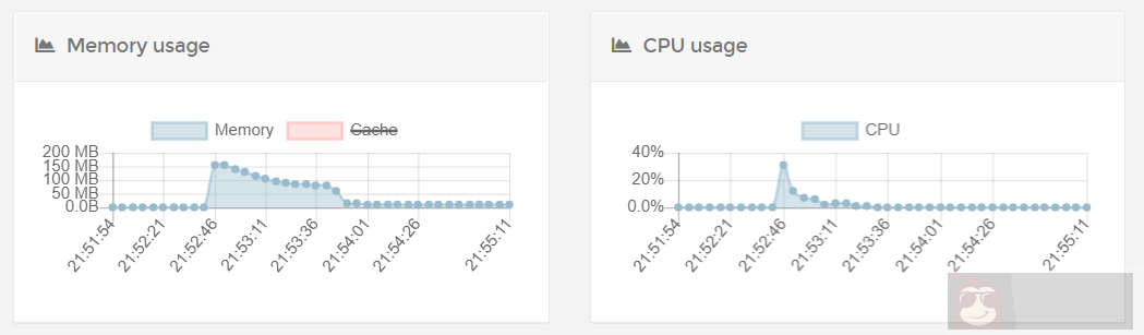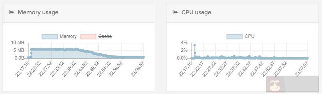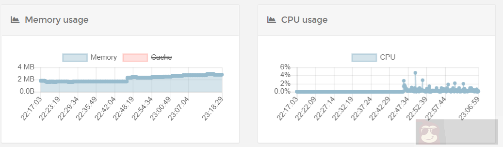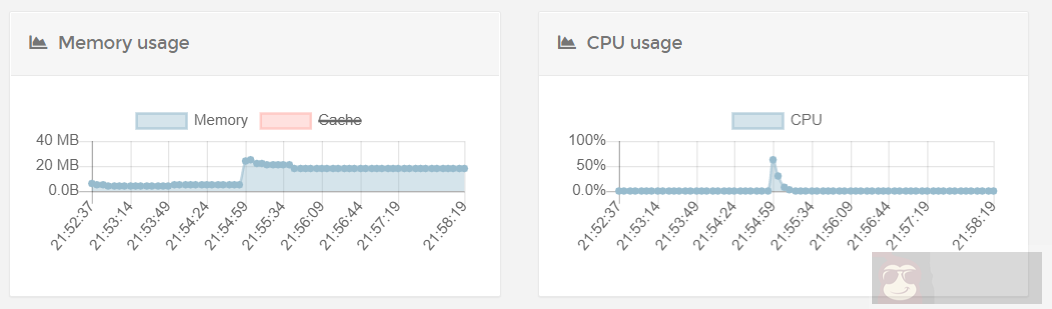 socat 与 Brook 均是通过 Docker 方式部署,部署完毕后,没有任何连接的情况下,内存占用情况如下。