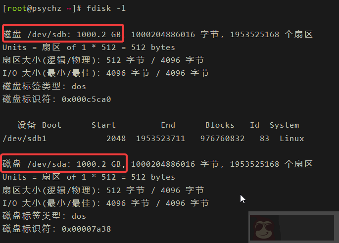 输入 fdisk -l 可看到有 2 块磁盘,分为为 /dev/sdb 和/dev/sda,如下图: