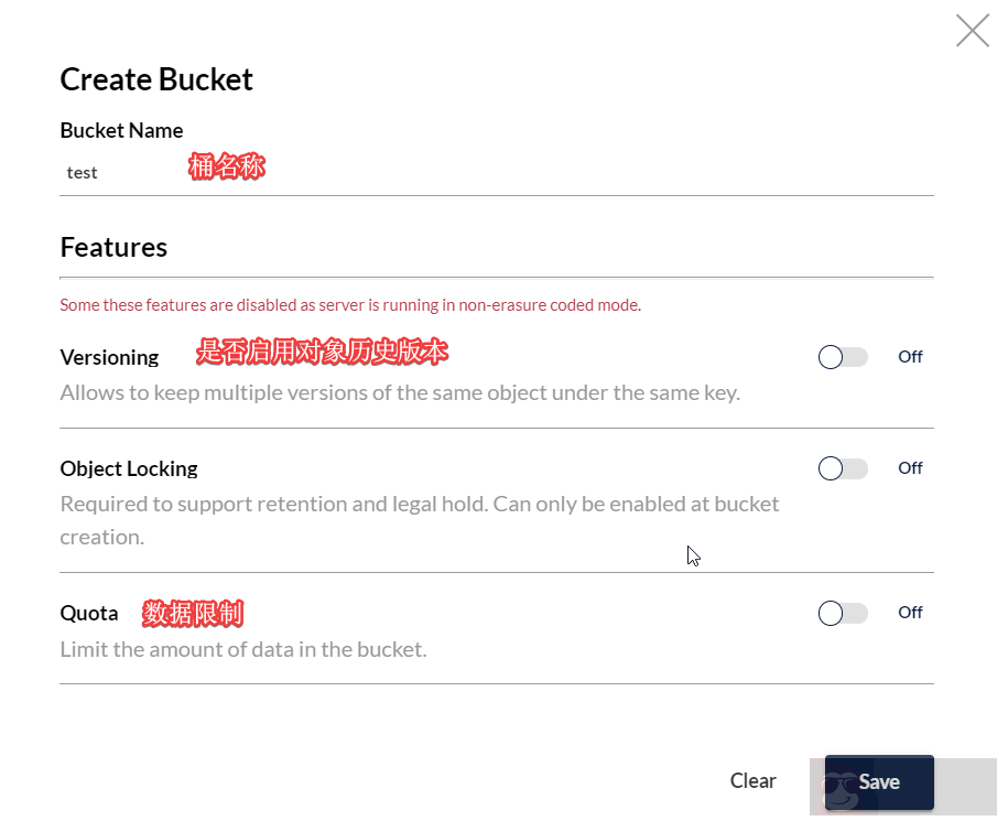 桶名称自己随便取一个,只要不重名就行。然后还可以选择是否启用对象(文件)历史版本,以及一些数据限制(比如容量或者文件数),不过上面是单磁盘运行的,似乎不支持这些特性。
