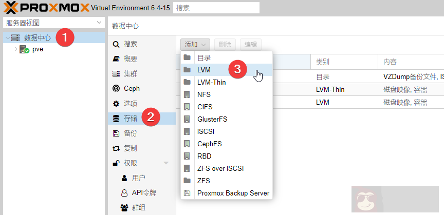 然后在“PVE 6.x 后台 – 数据中心 – 存储 – LVM”添加新的存储,这样虚拟机添加硬盘的时候就可以选择啦。