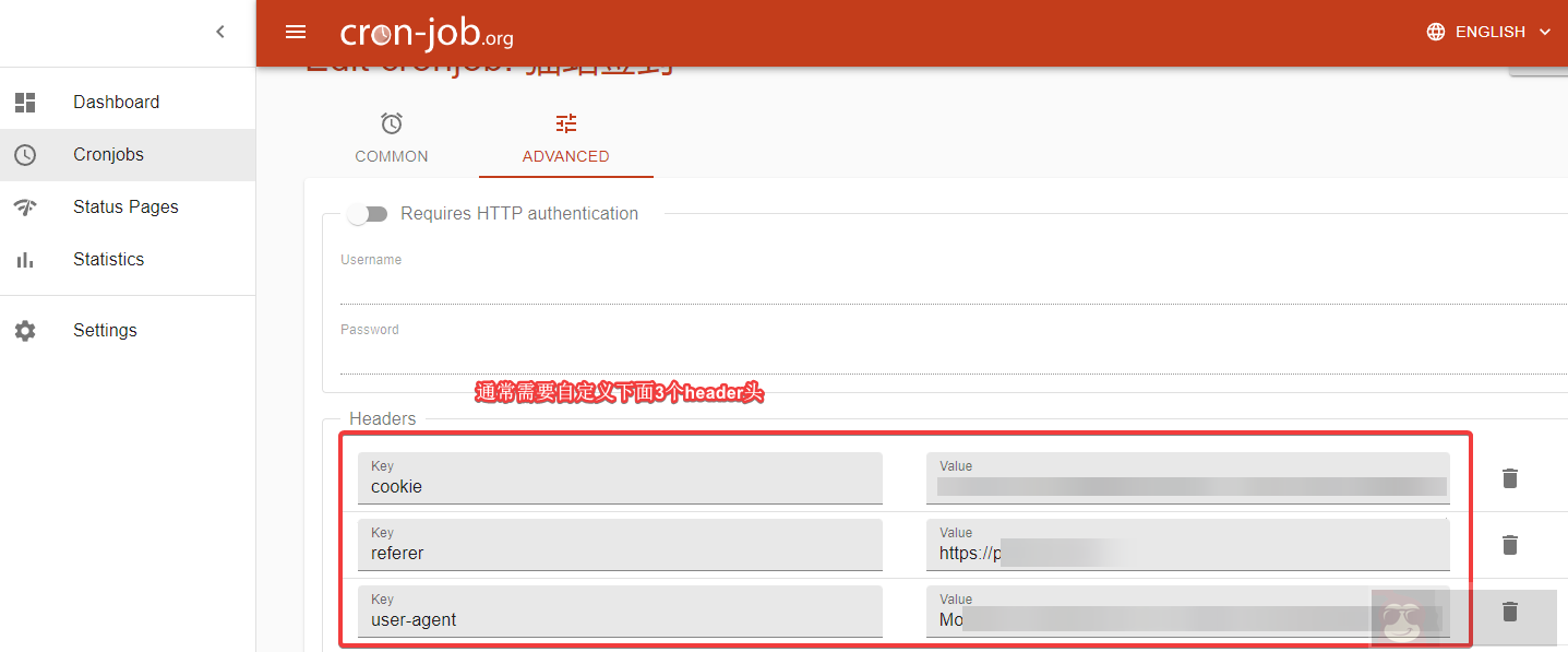 在后台:https://console.cron-job.org/jobs/create创建一个新的任务,在 COMMON 那里的设置如下截图(图片可点击放大)。