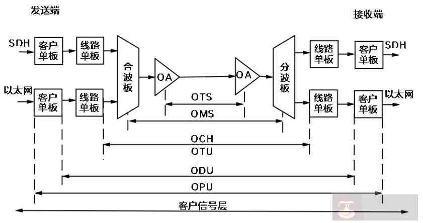 - 在接收端,通过分波器将光信号解复用,分出多路光信号,经线路单板和客户单板处理后,输出业务信号 SDH/ 以太网。