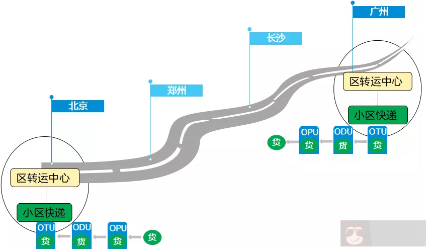 客户信号层:指 OTN 网络所要承载的业务信号,包括 IP、以太网、SDH 等。OPU(Optical Channel Payload Unit,光通道净荷单元):用来适配业务信号,使其适合在光通道上传输。ODU(Optical Channel Data Unit,光通道数据单元):以 OPU 为净负荷,增加相应开销,提供端到端光通道的性能监测。实现业务信号在 OTN 网络端到端的传送。OTU(Optical Channel Transport Unit,光通道传送单元):以 ODU 为净负荷,增加相应开销,提供 FEC 功能和对 OTU 段的性能监测。实现业务信号在 OTN 网络 3R 再生点之间传送。OCH(Optical Channel layer,光通道层):为业务信号提供端到端的组网功能,每个光通道 OCH 占用一个光波长,实现接入点之间的业务信号传送。OMS(Optical Multiplex Section layer,光复用段层):为经过波分复用的多波长信号提供组网功能,实现光通道在接入点之间的传送。OTS(Optical Transmission Section layer,光传输段层):提供在光纤上传输光信号的功能,实现光复用段在接入点之间的传送。 由邮寄快递来类比 OTN 分层结构。