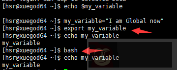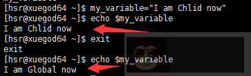 设定了全局变量,在该进程所创建的子进程中,该变量都是可见的。创建全局变量的方法是先创建一个局部变量, 然后导出到全局环境中。通过 export 来导出,变量名前面不加 $。如下图所示: