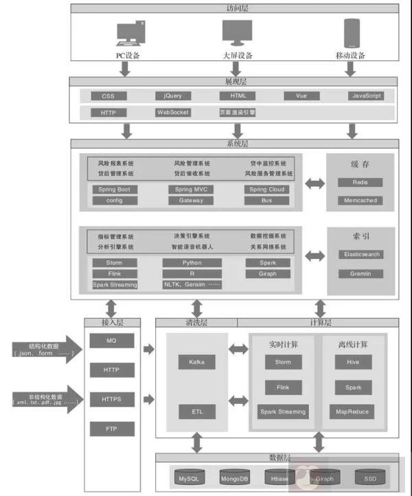 智能风控的核心技术是大数据风控技术,智能风控系统技术架构的设计应该以大数据平台为基础,充分融入大数据系统技术架构。