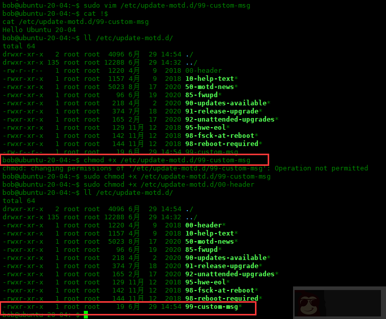 bob@ubuntu-20-04:~$ sudo chmod +x /etc/update-motd.d/99-custom-msg