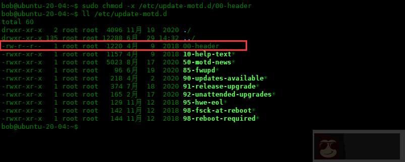 bob@ubuntu-20-04:~$ sudo chmod -R 644 /etc/update-motd.d/