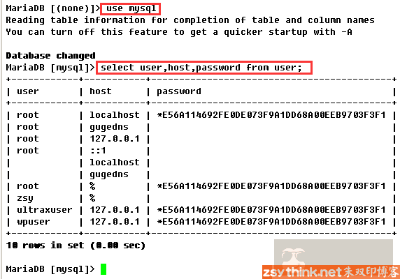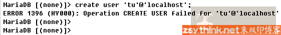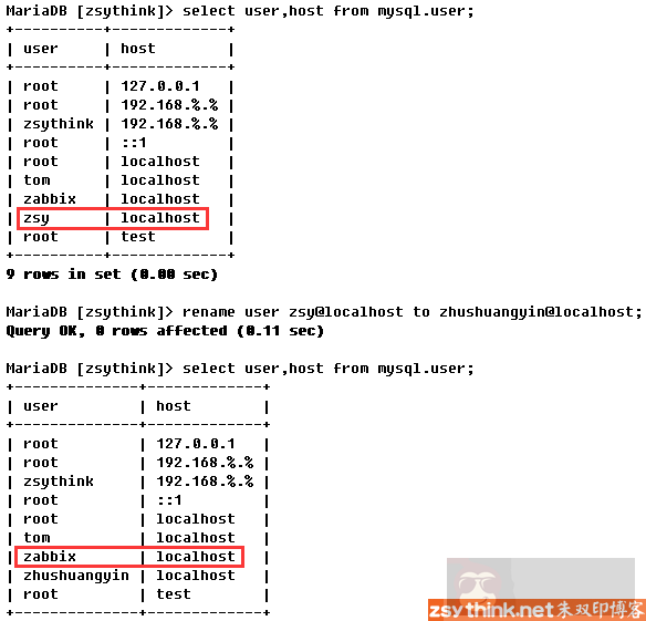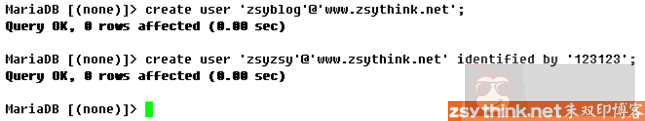 方法一:使用 create user 命令创建 mysql 用户,示例如下,示例中分别创建了两个用户,创建 zsyblog 用户时没有设定密码,创建 zsyzsy 用户时设定了密码。