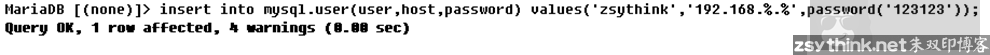如下示例直接在 mysql.user 表中插入了一条记录,添加了一个 zsythink 用户,密码为 123123,zsythink 用户可以通过 192.168.%.% 网段登录 mysql。