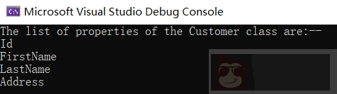 Console.WriteLine("The list of properties of the Customer class are:--");