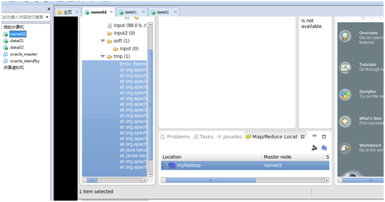 点击 ”Finish” 按钮,关闭窗口。点击左侧的 DFSLocations—>myhadoop(上一步配置的 location name),如能看到 user,表示安装成功,但是进去看到报错信息:Error: Permission denied: user=root,access=READ_EXECUTE,inode=”/tmp”;hadoop:supergroup:drwx———,如下图所示: